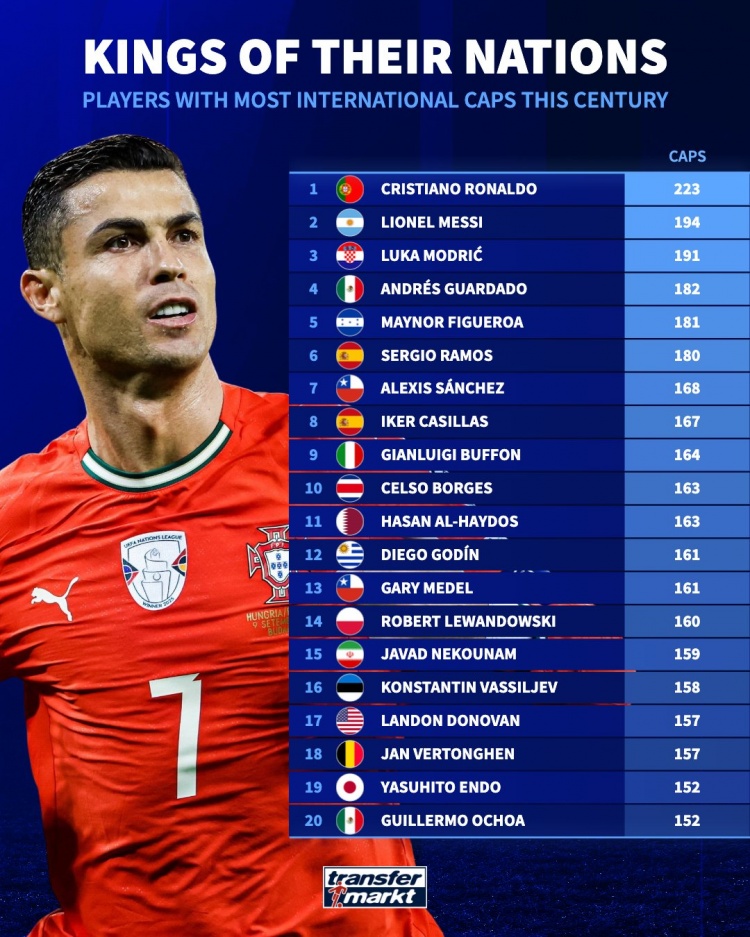 Dezhuan thống kê 20 cầu thủ ra sân nhiều nhất ở các giải đấu quốc tế trong thế kỷ này. Thứ hạng cụ thể như sau: