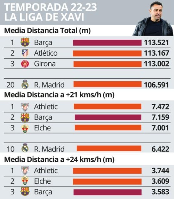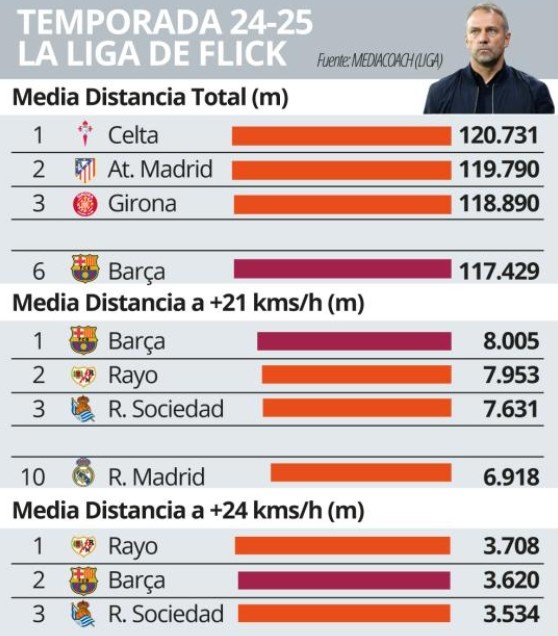 Vậy tình trạng thể chất của các cầu thủ như thế nào? Kết luận sơ bộ sau khi xem xét dữ liệu chạy bộ của Barcelona trong những năm gần đây là trong những năm họ giành chức vô địch giải VĐQG, dù dưới sự dẫn dắt của Xavi hay Flick, đội bóng này đều thể hiện tốt về mặt thể lực.