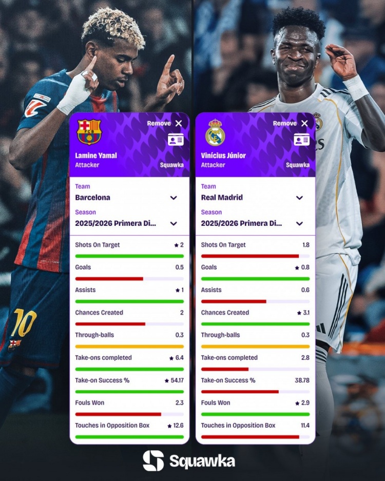 Real Madrid và Barcelona sẽ là tâm điểm của vòng đấu này tại La Liga. Cơ quan dữ liệu squakwa đã so sánh dữ liệu chính của Yamal và Vinicius ở La Liga mùa giải 2025/26 (các mục in đậm là dữ liệu có lợi):