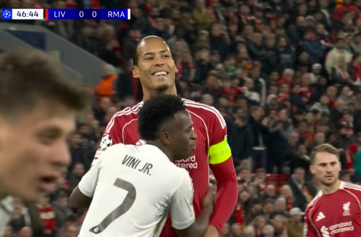 Điều này có nghiêm trọng không? Vinicius cao 1,76 mét thực hiện quả phạt góc và cản phá Van Dijk cao 1,95 mét. Hai người vừa cười vừa nói đùa.