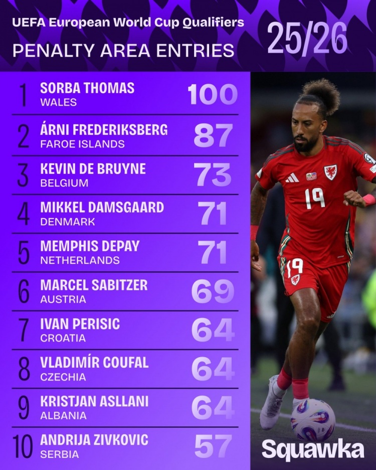Vòng bảng vòng loại Châu Âu Thế giới này đã kết thúc. Squakwa cũng đếm số lần đưa bóng vào vòng cấm ở giải đấu này, với cầu thủ chạy cánh người xứ Wales Solba Thomas dẫn đầu.