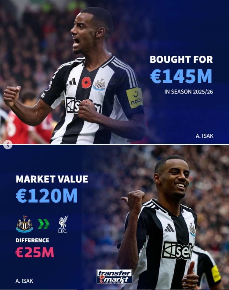 Isaac (Newcastle → Liverpool): 120 triệu nhân dân tệ, phí chuyển nhượng 145 triệu nhân dân tệ, cao cấp 25 triệu euro
